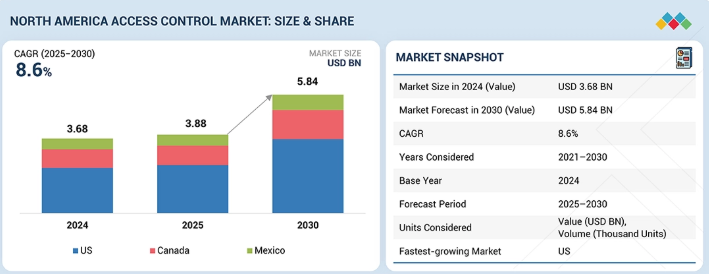 北米のアクセス制御市場は、2025年の38億8,000万米ドルから2030年までに58億4,000万米ドルに達すると予測されており、2025年から2030年までの年間平均成長率(CAGR)は8.6%となる見込みです。北米のアクセス制御市場は、商業用不動産の近代化、医療セキュリティの強化、政府およびキャンパス安全規制の厳格化を背景に、堅調な成長を遂げています。生体認証リーダー、スマートカード、クラウドベースのACaaS(アクセス制御としてのサービス)の導入が、オフィス、医療施設、教育キャンパス、重要インフラにおいて急速に拡大している。