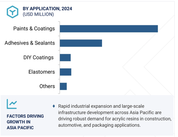 メタクリル酸エステルは、市販されているアクリル樹脂の中でも透明度、耐候性、耐薬品性が最も高く、高性能用途に使用されているため、予測期間中にアクリル樹脂市場で最も急成長する化学タイプになると予想されます。メタクリル樹脂は、コーティング剤、接着剤、プラスチックとして耐久性、接着性、紫外線安定性を高め、最も過酷な環境条件下でも美観を保ち、機能を維持します。この成長は、低VOCで環境に適合した配合を目指す業界の活動だけでなく、立法措置によっても支えられています。コーティング剤や樹脂のメーカーは、EUのREACH規制や米国EPA大気浄化法規制を理解した上で、溶剤ベースの処方を改良・見直す必要性を認識しており、これらは製造全体の一部となっています。