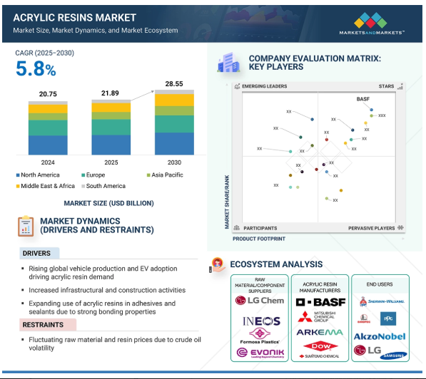 アクリル樹脂市場は、予測期間中の年平均成長率(CAGR)5.8%で、2025年の218.9億米ドルから2030年には285.5億米ドルに達すると予測されています。アクリル樹脂業界は、樹脂技術や既成処方の進歩により最終用途産業が成長を続け、長持ちする多目的コーティング剤や粘着剤オプションのニーズが拡大し続けているため、世界的に安定した上昇傾向にあります。世界の自動車生産台数は2020年の7,760万台から増加し、2024年には9,350万台を突破。中国の自動車生産台数は、旺盛な内需と電気自動車の急速な普及に支えられ、2024年には約31%のシェアになります。アクリルは、耐候性と美観に優れた自動車用の新しい軽量システムであるため、需要が伸びています。中国に続き、アジア太平洋地域や中東でも建設活動の加速が予測される中、アクリル樹脂は性能と持続可能性に対する厳しい要求を満たすため、建築用塗料、防水膜、工業用塗料への使用が増加しています。国連によると、世界的な都市人口の増加により、2050年までに新たに22億人が都市に住むようになり、高性能樹脂ベースの保護システムを必要とするインフラや住宅開発が推進されると予想されています。