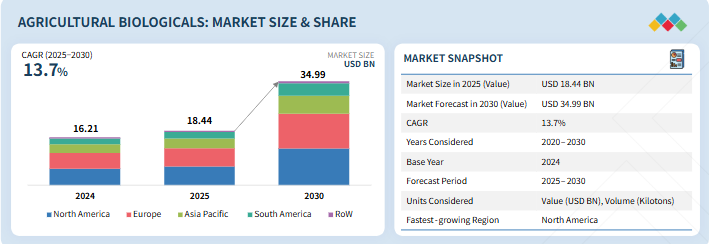 農業用生物製品市場は、2025年の184億4000万米ドルから2030年までに349億9000万米ドルに達すると予測されており、2025年から2030年までの年間平均成長率(CAGR)は13.7%となる見込みである。この市場には、植物の健康、土壌の肥沃度、持続可能な農業を促進する生物農薬、生物刺激剤、生物肥料などの天然農産物資材が含まれる。成長は、環境に優しい代替品への需要、有機農業、化学物質に対する規制強化によって推進されている。主な用途には、作物保護、種子処理、土壌改良が含まれる。課題としては、性能の一貫性、農家の認知度、規制上の障壁が挙げられる。