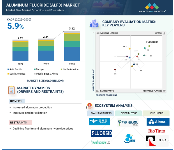 フッ化アルミニウム(AlF3)市場は、予測期間中に年平均成長率5.9%で、2025年の23.4億米ドルから2030年には31.2億米ドルに成長すると予測されています。フッ化アルミニウム(AlF3)の需要が増加している主な理由は、電解製錬プロセスの重要なフラックスとしてAlF3に依存している世界のアルミニウム産業の着実な成長です。アルミナの融点を下げ、電解液の伝導性を向上させることで、AlF3はエネルギー使用量を削減し、アルミニウムの生産量を高めるのに役立ち、製錬業者にとって不可欠なものとなっています。自動車、航空宇宙、包装、建設セクターにおける軽量アルミニウムの需要の高まりは、消費をさらに増加させます。電気自動車や近代的なインフラプロジェクトにおいて、軽量で燃費の良い材料へのシフトがアルミニウムの生産を促進し、AlF3の需要を高めています。加えて、製錬の技術的進歩が続いており、効率改善と排出量削減への取り組みが、製錬業者によるより高品質のAlF3 グレードの採用を促し、世界的な消費量の継続的な増加を支えている。