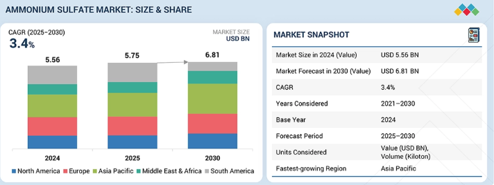 硫酸アンモニウム市場は、予測期間中に年平均成長率(CAGR)3.4%で拡大し、2025年の57億5,000万米ドルから2030年には68億1,000万米ドルに達すると見込まれています。硫酸アンモニウムの需要増加は、その費用対効果と安定した性能により、窒素・硫黄系肥料、水処理、および産業用途での利用が牽引しています。