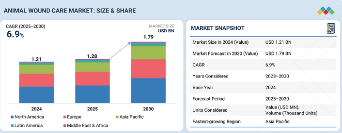 動物用創傷ケア市場は、予測期間中に年平均成長率(CAGR)6.9%で成長し、2025年の12億8,000万米ドルから2030年には17億9,000万米ドルに達すると予測されている。ペットの飼育増加、獣医療分野の研究拡大、動物医療費の増加など、複数の要因が動物用創傷ケア製品の需要を牽引している。ペットオーナーが動物の健康と福祉により注力するにつれ、革新的な創傷ケア製品や治療法への需要が高まっており、これが市場成長に寄与している。ただし、新興地域におけるペットケアの高コストといった課題がこの成長に影響を与える可能性がある。こうした課題はあるものの、創傷管理製品の革新的な開発は、動物医療と福祉の向上につながる機会を提示している。本レポートでは、動物創傷ケア市場を製品別、動物種別、流通チャネル別、エンドユーザー別、地域別にセグメント化している。