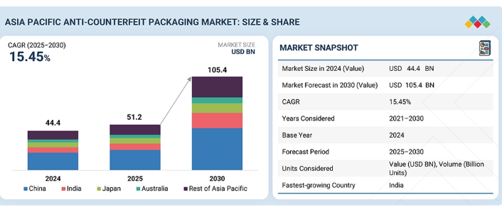 アジア太平洋地域の偽造防止包装市場は、2025年の512億米ドルから2030年までに1,054億米ドルに達すると予測されており、2025年から2030年までの年間平均成長率(CAGR)は15.45%となる見込みです。医薬品、電子機器、FMCG(日用消費財)分野における製品不正の増加、規制当局による取り締まりの強化、デジタル認証技術の急速な普及を背景に、アジア太平洋地域の偽造防止包装市場は拡大傾向にある。