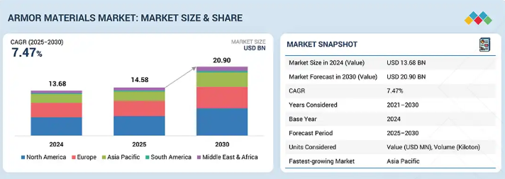 装甲材料市場は、2025年から2030年にかけて年平均成長率7.47%で、2025年の145.8億米ドルから2030年には209.0億米ドルに達すると予測されています。装甲材料は、弾丸、爆弾、地雷、その他の弾道または爆発性の脅威からの貫通または損傷に抵抗することができます。これらの材料は通常、高い強度、耐久性、靭性に加え、硬度、弾力性、変形抵抗などの特殊な特性を備えています。装甲は、車両、個人、建築部品、その他の物体など、軍事および民生資産に施される保護層または保護層の組み合わせであり、敵対的環境や戦争状況において武器による損傷からこれらを保護するためのものです。装甲は、金属・合金、セラミック、複合材料、パラ系アラミド繊維、超高分子量ポリエチレン(UHMWPE)、ガラス繊維などのさまざまな材料で作られています。世界の装甲材料市場は、防衛近代化プログラムの増加や、軍事、航空宇宙、法執行の各用途における軽量かつ高性能な防護ソリューションに対する需要の高まりによって成長しています。