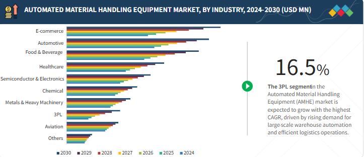 AMHE市場は、自動車、化学、航空、半導体・エレクトロニクスなど、オートメーションが精度と効率をサポートする多様なセクターに対応しています。Eコマース、食品・飲料、ヘルスケア業界では、大量オペレーションとコンプライアンス・ニーズを管理するためにAMHEの導入が増加しています。また、ロジスティクスとスループットを最適化するために、金属・重機械や3PLサービスでの採用も増加しています。その他、製紙、印刷、繊維、衣料などの業界では、AMHEを活用して生産性の向上とサプライチェーンの合理化を図っています。電子商取引は、オンライン小売の急成長と、大量の注文を管理し配送を迅速化する自動フルフィルメントセンターのニーズの高まりにより、大きなシェアを占めると予測されています。