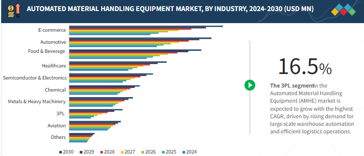 AMHE市場は、自動化が精度と効率を支える自動車、化学、航空、半導体・電子機器など多様な分野に対応しています。Eコマース、食品・飲料、医療業界では、大量処理業務とコンプライアンス要件の管理のためにAMHEの導入が増加しています。金属・重機械や3PLサービス分野でも物流と処理能力の最適化を目的に導入が増加中。製紙、印刷、繊維、衣料品などの他産業では、生産性向上とサプライチェーン効率化のためにAMHEを活用。オンライン小売の急成長と、大量注文管理・配送加速のための自動化フルフィルメントセンター需要増により、Eコマース分野が大きなシェアを占めると予測される。