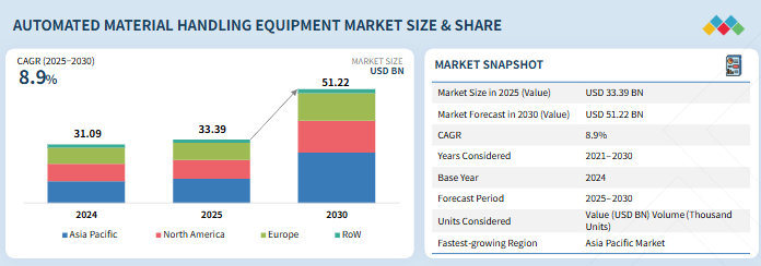 世界の自動化マテリアルハンドリング機器(AMHE)市場は、2025年の333億9000万米ドルから2030年までに512億2000万米ドルへ成長し、年平均成長率(CAGR)8.9%を記録すると予測されている。この成長は、効率性向上、労働力依存度の低減、サプライチェーンの回復力強化を目的とした製造・物流分野における自動化需要の増加によって牽引されている。産業用ロボット、無人搬送車(AGV)、自動倉庫システム(ASRS)、倉庫管理システム(WMS)といった主要システムは、AI、IoT、スマート工場統合の進展に支えられ、導入が急速に進んでいる。