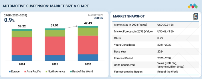 自動車サスペンション市場は、2025年の399億1000万米ドルから2032年までに424億3000万米ドルに達すると予測され、年平均成長率(CAGR)は0.9%となる。市場成長は電動化、乗り心地、エネルギー効率への移行によって牽引され、OEMメーカーは軽量化、電子制御、適応型サスペンションシステムの採用を促進している。特にEVプラットフォームでは、バッテリー重量を相殺し航続距離設計を改善するため、重量最適化かつソフトウェア調整可能なサスペンションが北米で求められている。SUVではコンパクトでコスト効率の高い設計からマクファーソンストラットサスペンションが80%以上を占める一方、プレミアムSUVではハンドリング性能・キャンバー制御・走行時の関節可動域向上のため、ダブルウィッシュボーン式フロントとマルチリンク式リア(採用率8~10%)が採用されている。エアサスペンションはハイエンドモデルに限定されるものの、特にプレミアムICE/EV SUVにおいて、OEMが快適性と適応型減衰を優先する傾向から普及が進んでいる。ピックアップトラックでは、フロントサスペンションはダブルウィッシュボーン(75~80%)とマクファーソン(15~20%)が主流である一方、リアサスペンションはリーフスプリング(70%以上)とマルチリンク(20~25%)が採用されており、この構成は軽作業用途における耐久性と乗り心地への需要の高まりによって決定されている。