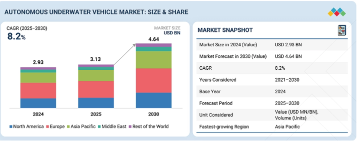 自律型水中車両(AUV)市場は、2025年の31億3,000万米ドルから2030年までに46億4,000万米ドルに達し、年平均成長率(CAGR)は8.2%と予測される。数量ベースでは、2025年の997台から2030年までに1,424台へ成長する見込みである。この成長は、防衛監視、海洋エネルギー検査、深海調査、高度な自律マッピング任務におけるAUVの採用拡大によって牽引されている。