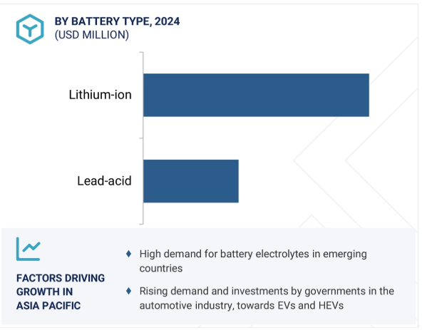 電解質タイプ別では、液体電解質セグメントが予測期間中、金額ベースでバッテリー電解質市場で最も高いCAGRを記録する見込みです。液体電解質は、電池電解質市場で最も広く使用されているセグメントで、主に電子機器や電気自動車、大規模エネルギー貯蔵システムなど、様々な用途のリチウムイオン電池に採用されています。液体電解質はイオン伝導性が高く、基本的にあらゆる電極化学に適合します。この分野は、安全性とサイクル寿命を向上させ、より高い電圧レベルで利用できる溶媒ブレンド、リチウム塩配合、機能性添加剤の進歩が続いているため、市場のCAGRが引き続き最も高くなっています。