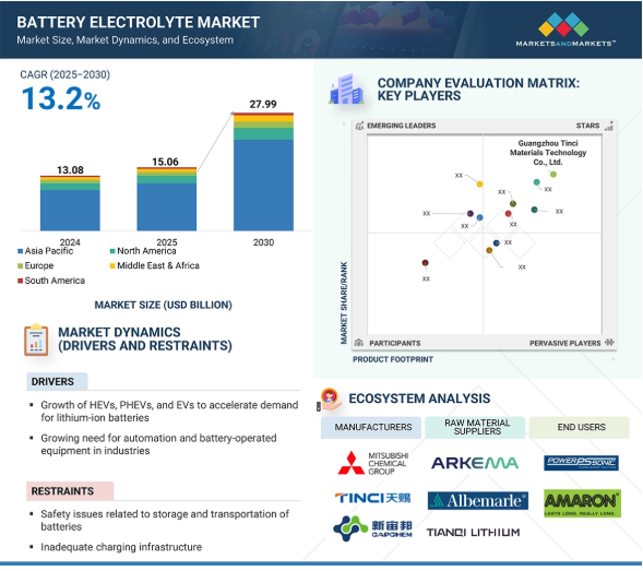 世界の電池用電解質市場は、2025年の150億6,000万米ドルから2030年には279億9,000万米ドルに成長し、予測期間中の年平均成長率は13.2%と予測されています。電解質は、正極と負極の間で電荷の貯蔵と移動を可能にしながら、これらの電池に再充電性を提供する重要な材料です。電解質の選択とその性能は、電池の効率、安全性、耐久性に影響します。一般的に、電解液には導電性媒体、すなわちリチウムイオン電池の場合は有機溶媒に溶解したリチウム塩、鉛蓄電池の場合は硫酸溶液が含まれ、安定性、導電性、安全性を向上させる様々な機能性添加剤が添加されています。電池用電解液市場は、電解液の種類、電池の種類、最終用途によって分類することができます。電解質タイプ別のバッテリー電解質市場には、液体電解質、固体電解質、ゲル電解質が含まれます。電池タイプ別の電池電解質市場には、鉛蓄電池とリチウムイオン電池が含まれます。電池用電解質は、電気自動車、家電製品、エネルギー貯蔵、その他の用途など、多くの最終用途で使用することができます。電池電解質市場は、多くの分野での電化の進展、よりクリーンなエネルギーソリューションへの広範な需要、電池に対応した持続可能なモビリティとエネルギーシステムに対する世界的な要望の拡大により、電池市場が成長を続けているため、大きく成長しています。