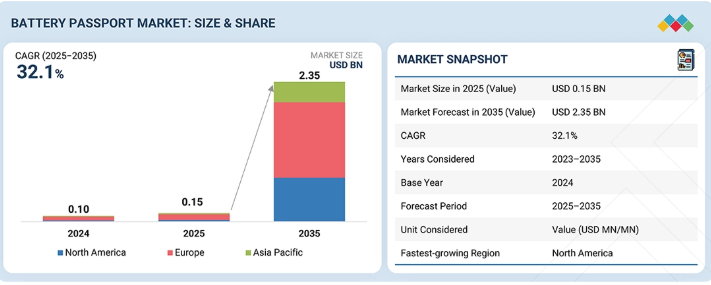 バッテリーパスポート市場規模は、2025年の1億5000万米ドルから2035年までに23億5000万米ドルへ成長し、年平均成長率(CAGR)32.1%を記録すると予測される。規制圧力の高まり、EV生産の加速、国境を越えた材料移動の拡大により、認証済みで接続され監査可能なライフサイクルデータへの需要が増加し、市場は世界のバッテリー供給ネットワークを急速に変革している。