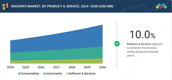 バイオチップ市場は、機器、消耗品、ソフトウェア・サービスで構成される。消耗品はあらゆる試験・アッセイに必須であり、継続的な需要を確保するため最大のセグメントである。研究、診断、臨床応用における頻繁な使用が安定した収益と市場支配力を支えている。