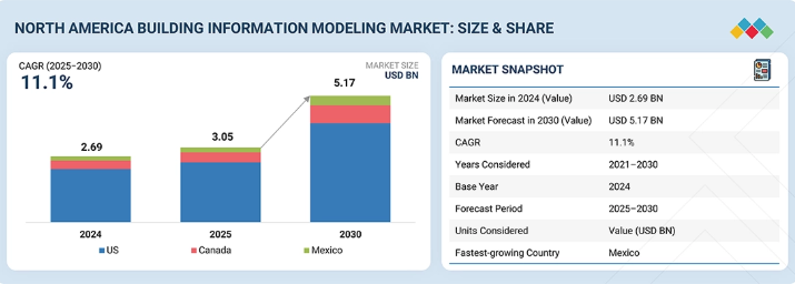 北米のビルディングインフォメーションモデリング(BIM)市場は、2025年の30億5,000万米ドルから2030年までに51億7,000万米ドルへ成長し、2025年から2030年までの年間平均成長率(CAGR)は11.1%と予測される。連邦および州のインフラプログラムへの投資増加、デジタルツインおよびBIMを活用したライフサイクル管理の導入拡大、持続可能でエネルギー効率の高い建築手法への注目の高まり、ならびにAEC関係者全体におけるリアルタイムコラボレーション、生産性向上、高度なプロジェクト可視化への需要拡大が、予測期間中に北米のBIM市場を牽引する主な要因である。