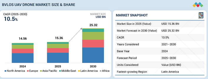 視界外飛行(BVLOS)無人航空機(UAV)市場は、2025年の153億6000万米ドルから2030年までに253億2000万米ドルへ、年平均成長率(CAGR)10.5%で成長すると予測される。この成長は、市場で最大のシェアを維持し続ける最大離陸重量(MTOW)150kg未満のカテゴリーにおける軽量プラットフォームの強力な利用によるものである。また、完全自律機能がより一般的になるにつれて市場は拡大しており、BVLOS運用における長距離ミッションの効率性向上、自動化されたミッション実行、リアルタイム意思決定の改善に貢献している。自律航法、搭載コンピューティング、長距離航続性能の向上は、BVLOS UAVの採用をさらに推進している。