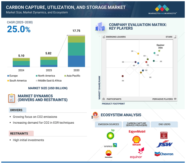 炭素回収・利用・貯留(CCUS)市場は、年平均成長率25.0%で、2025年の58.2億米ドルから2030年には177.5億米ドルに達すると予測されています。CCUS市場は、大小さまざまなプレイヤーの存在や、主要市場における研究開発活動の活発化など、さまざまな要因が絡み合って力強い成長を遂げています。
