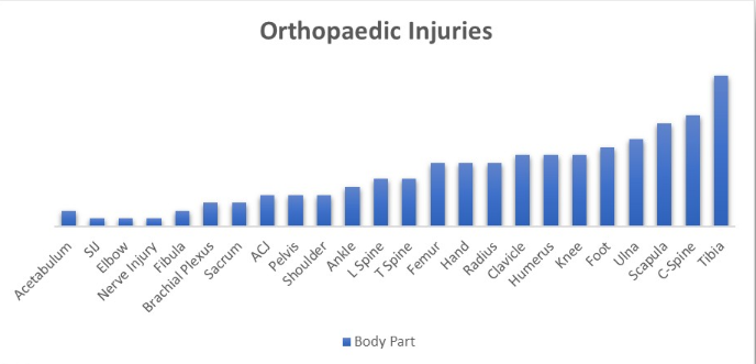 例えば、毎年2,848件の整形外科外傷症例が入院しており、そのうち男性が1,595人、女性が1,253人でした。最も多い外傷は転倒によるもの(40.77%)で、次いで交通事故(33.77%)でした。その他の外傷には、動物による襲撃や咬傷(14.53%)が含まれます。下肢骨折が最も多く(47.22%)、次いで上肢骨折(32.44%)でした。その他の外傷には、切創および腱損傷(10.35%)が含まれます。