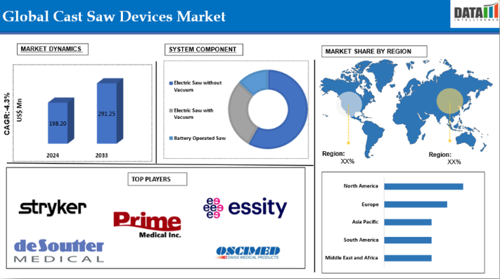 DataM Intelligenceのレポートによると、世界のギプス切断装置市場は2024年に1億9,820万米ドルに達し、2033年までに2億9,125万米ドルに達すると予想されています。2025年から2033年の予測期間中は、年平均成長率(CAGR)4.3%で成長すると見込まれています。