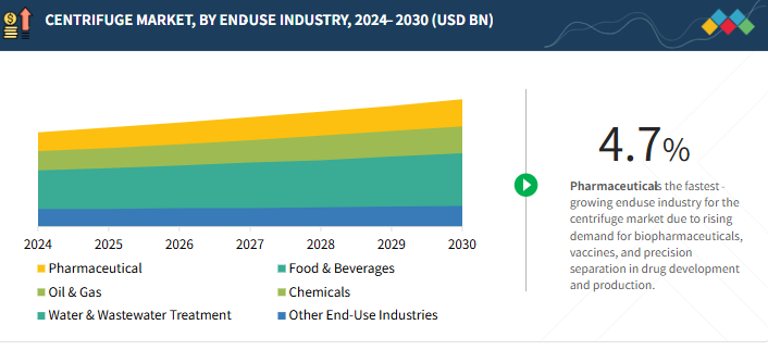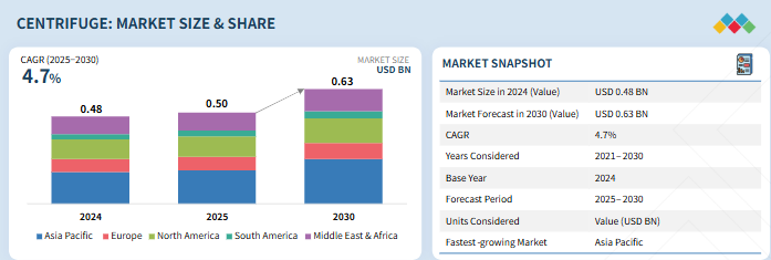 遠心分離機市場は、予測期間中に年平均成長率 4.7%で、2025 年の 5,000 億米ドルから 2030 年には 6 億 3,000 万米ドルに達すると予測されています。遠心分離機市場は、製薬、バイオテクノロジー、食品・飲料、化学、鉱業、廃水処理などの産業における多様な用途に後押しされ、力強い成長を遂げています。遠心分離機は、固液分離、流体の清澄化、製品の精製において重要な役割を果たし、工業用と研究室用の両方で不可欠なものとなっています。製薬・バイオテクノロジー分野では、生物製剤、ワクチン、細胞ベースの治療に対する需要の高まりが、精密分離のための高度な高速・超遠心機の採用を促進しています。一方、産業分野では、廃水管理、汚泥脱水、資源回収のために遠心分離機が重用されており、世界的な持続可能性への取り組みや厳しい環境規制との整合性が図られています。
