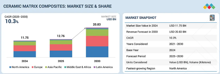 セラミックマトリックス複合材料のグローバル市場規模は2025年に127.6億ドル、2030年までにCAGR 10.3%で拡大する見通し