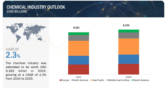 世界の化学産業は、2024年に6兆1,820億米ドルの規模になると推定され、2024年から2025年までの年平均成長率は2.3%で、2025年には6兆3,240億米ドルに成長すると予測されています。2024年、世界の化学産業は、パンデミックによる経済再編と持続可能性の追求から回復し、緩やかなペースで成長。成長が促進されたのは、自動車、建設、エレクトロニクス産業からの安定した需要に加え、バッテリーケミカル、軽量材料、再生可能原料といったエネルギー移行材料への需要が加速したためです。2025年までには、クリーンエネルギー、循環型経済の概念、持続可能な製造業を規定する政府の政策やインセンティブが定着しているため、業界は急速にキャッチアップする必要があります。アジア太平洋地域は引き続き市場のリーダーであり続け、中国の化学製品生産は、主に建設と自動車産業からの政策主導の需要に後押しされ、約5.0%の増加を維持する水準に上昇するでしょう。ヨーロッパは、低水準の生産を維持し、輸入に大きく依存しながらも、緩やかな回復を経験しています。世界経済が不透明であるにもかかわらず、特殊化学品へのアプローチだけでなく、持続可能なソリューションに向けたスピードが成長を後押ししているためです。