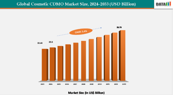 世界の化粧品CDMO市場は、2023年に224億4,000万米ドルに達し、2024年には235億米ドルに増加し、2033年には357億9,000万米ドルに達すると予測され、2025年から2033年の予測期間中にCAGR 5.4%で成長する見込みです。