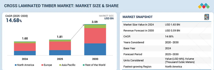 2025年から2030年までの年平均成長率は14.68%で、2025年の18億930万米ドルから2030年には35億8880万米ドルに達すると予測されています。集成材は、無垢の製材板を交互に(通常は90度の角度で)積み重ね、構造用接着剤で接着した人工木材製品。持続可能で低炭素な建築材料に対する需要の高まりと、より迅速でコスト効率に優れ、環境に優しい建築ソリューションに対する嗜好の高まりにより、市場は成長中。