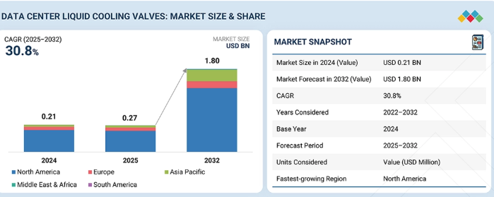 データセンター向け液体冷却バルブ市場は、2025年の2億700万米ドルから2032年までに18億米ドルへと成長し、予測期間中の年平均成長率(CAGR)は30.8%になると見込まれています。世界のデータセンター用液体冷却バルブ市場は、冷却ネットワーク全体における冷却剤の流れを正確かつ確実に制御する必要がある液体ベースの熱管理システムへの移行が進んでいることから、拡大しています。精密な流量制御システムへの需要の高まりにより、温度に関連する性能低下を防ぐ安定した動作条件を維持しつつ、複数の機器ゾーンにわたって均一な冷却が可能になります。バルブは、圧力制御を維持しながら流量の方向を管理し、冷却分配ユニットとサーバー冷却システム間の接続を確立することを可能にするため、冷却システムにおいて不可欠な構成要素として機能します。運用上のリスクを低減しつつ保守手順を強化する必要性が高まる中、組織は、システム全体の稼働を妨げることなく冷却システム内で安全なセクション隔離を可能にするバルブの導入を進めています。デジタルインフラの拡大と組織による液体冷却技術の採用が進むにつれ、信頼性の高い熱管理ソリューションを提供する高度な液体冷却バルブに対する需要は着実に高まっています。
