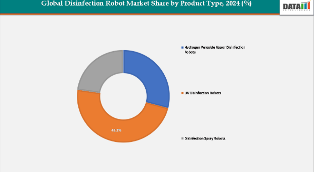 UV消毒ロボットは、その実証された有効性、化学薬品を使用しない操作性、迅速で信頼性の高い消毒を大規模に提供する費用対効果から、医療提供者や公共施設からのUV-C技術への信頼が高まっていることから、消毒ロボット市場の世界売上高の約43.2%を占め、圧倒的なシェアを占めています。