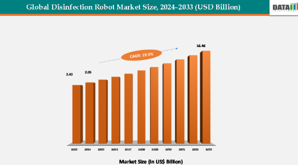 消毒ロボットの世界市場は、2023年に34.0億米ドルに達し、2024年には39.5億米ドルに増加し、2033年には164.6億米ドルに達すると予測され、予測期間2025-2033年のCAGRは19.5%で成長する見込みです。