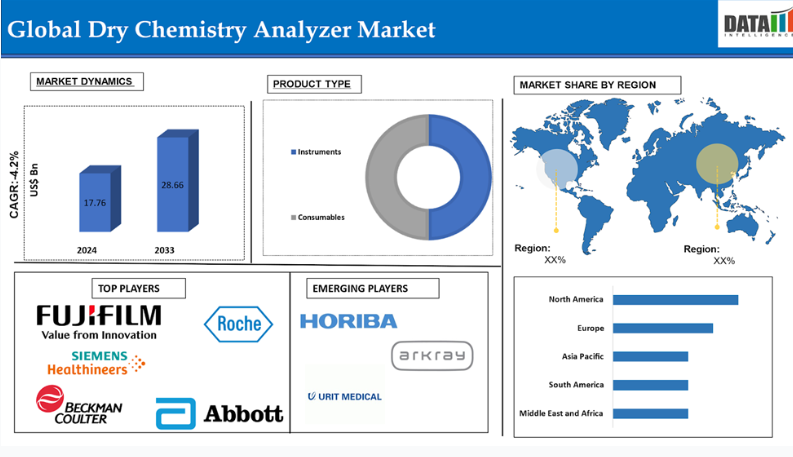 DataM Intelligenceのレポートによると、世界のドライケミストリー分析装置市場は2024年に177億6,000万米ドルに達し、2033年までに286億6,000万米ドルに達すると予想されています。2025年から2033年の予測期間中は、年平均成長率(CAGR)4.2%で成長すると見込まれています。