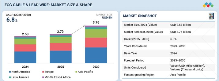 世界の心電図ケーブル・リード線市場は、2025年の27億米ドルから2030年までに37億6000万米ドルに達すると予測されており、予測期間中に年平均成長率(CAGR)6.8%で成長する見込みです。この着実な成長は、高齢人口の拡大と世界的な心血管疾患の有病率上昇に牽引されています。高齢者は心臓疾患にかかりやすいため、正確かつ継続的な心電図モニタリングの必要性が急速に高まっています。さらに、信号精度の向上、製品耐久性の強化、使い捨てリードシステムの導入といった技術的進歩が、市場の普及をさらに加速させ、成長を支えている。