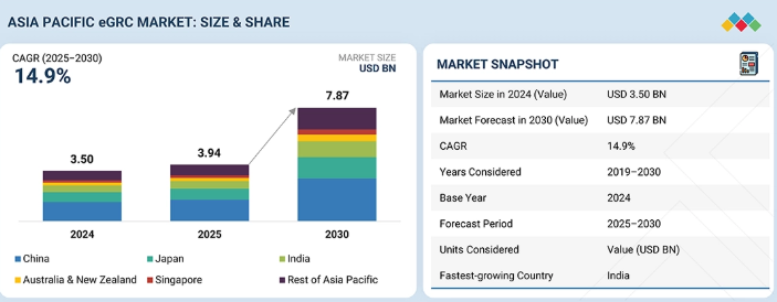 アジア太平洋地域のeGRC市場は、2025年の39億4,000万米ドルから2030年までに78億7,000万米ドルに達すると予測されており、2025年から2030年までの年間平均成長率(CAGR)は14.9%となる見込みです。アジア太平洋地域では、インドネシアのDPDP法、シンガポールのMAS TRMガイドライン、オーストラリアのAPRA CPS 234およびCPS 230など、多くのコンプライアンス規制が制定されている。BFSI(銀行・金融・保険)、医療、通信、インフラ分野における様々な枠組みや業界固有の義務付けによる規制圧力こそが、同地域におけるeGRC市場の急成長を牽引する二大要因である。eGRC市場の重要なトレンドとして、より多くの企業がクラウドベースのAI搭載ガバナンスソリューションを採用し、リスク環境の可視性向上、コンプライアンスワークフローの改善・強化、リスクとコンプライアンスの監視・管理の自動化を図っている。新たなユースケースとして、AIを活用した継続的モニタリング、SaaS型eGRCソリューション、サードパーティリスク管理が、同地域のeGRC市場に新たな持続的成長機会を創出する見込みである。