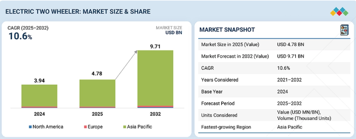 電動二輪車市場は、2025年の47億8,000万米ドルから2032年までに97億1,000万米ドルへ、年平均成長率(CAGR)10.6%で成長すると予測されている。ラストマイル配送とシェアリングモビリティ向けフリートが都市部における電動二輪車需要の大きな割合を占めるようになり、OEMメーカーはフリート対応プラットフォーム、長寿命バッテリー、統合テレマティクスを優先するようになった。メーカーはサブスクリプション型またはバッテリー・アズ・ア・サービス(BaaS)モデルを採用することでコスト効率を改善し、商用事業者向けに柔軟で手頃な価格の選択肢を提供している。また、航続距離の延長と性能向上のために高エネルギー密度セルも採用している。柔軟性の向上とサプライチェーンリスク低減のため、OEMメーカーは現在、バッテリー化学組成のデュアルソーシングを実施している。手頃な価格の量産モデルにはLFP(リン酸鉄リチウム)を採用し、プレミアムモデルやデザイン重視のパックにはNMC(ニッケル金属水素化物)を採用。両化学組成に対応可能な設計パックにより、生産と調達を簡素化している。