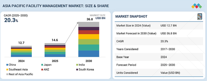 アジア太平洋地域の施設管理市場規模は、予測期間中に年平均成長率(CAGR)20.3%で拡大し、2025年の146億米ドルから2030年には368億米ドルに達すると見込まれる。この市場は、新興経済国と成熟経済国双方における急速な都市化、継続的な商業建築、機関向けインフラ投資の増加によって牽引されている。中国、インド、日本、オーストラリア、および複数の東南アジア市場を含む各国では、建物や資産ポートフォリオの規模拡大に伴い、専門的な施設サービスへの需要が高まっている。施設管理プロバイダーは、オフィス、工業施設、医療施設、交通関連インフラのサポートにますます関与している。アジア太平洋地域全体では、施設運営は外部委託サービスと内部チームの組み合わせによって行われている。複数の拠点に分散した活動を監督するため、デジタルシステムの活用が拡大している。コスト管理、サービスの一貫性、規制順守への意識の高まりが、公共・民間セクター双方における市場成長をさらに後押ししている。