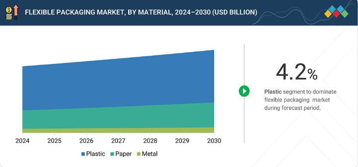 素材別のフレキシブル包装市場には、プラスチック、紙、金属が含まれます。プラスチックが最大のセグメントであり、紙は市場で最も急速に成長しているセグメントです。