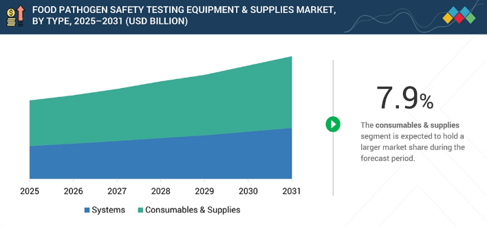 食品安全への関心の高まりや食中毒の増加、さらには食品加工業界全体に広がる厳しい規制要件を背景に、食品病原体安全検査機器・消耗品市場は着実な成長を遂げると予測されています。また、加工食品や即食食品への需要の高まりや、効率的な病原体検出ソリューションの必要性から、食品生産および品質管理プロセスにおける検査機器、消耗品、キットの使用も増加しています。
