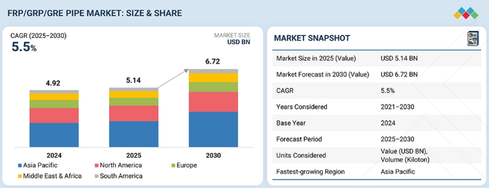 FRP/GRP/GREパイプ市場規模は2025年に51億4000万米ドルと評価され、2030年までに年平均成長率(CAGR)5.5%で67億2000万米ドルに達すると予測されている。鋼管やコンクリート管の代替品として、GRE/FRP/GRPパイプの人気が高まっています。主な理由は、耐食性、軽量性、そして水道、廃水、化学薬品、エネルギーのパイプラインとして使用した場合の長寿命にあります。アジア太平洋地域および中東地域では、上水道、海水淡水化プラント、下水処理、地域冷房への投資が増加しており、これらのパイプは使用寿命が長く、最小限のメンテナンスで済み、大口径送水パイプラインシステムとして使用した場合に優れた水力性能を発揮するため、採用が拡大している。さらに、石油・ガス、石油化学、海洋産業における急速な都市化と産業成長に伴い、腐食性環境や多用途用途(フローライン、消防用水、坑内管など)においてFRP/GRP/GRE材料の需要が高まっています。