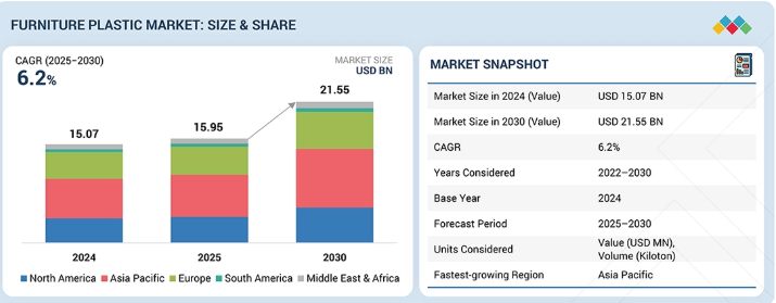 家具用プラスチック市場は、予測期間中に年平均成長率(CAGR)6.2%で成長し、2025年の159億5,000万米ドルから2030年には215億5,000万米ドルに達すると予測されている。都市部の住宅需要の拡大に加え、商業・公共施設セクターの成長が、住宅用および非住宅用プラスチック家具の需要を牽引する主要因となっている。家具メーカーは、製品の軽量化、無限のデザイン可能性、特に大量生産・価格競争の激しい市場における生産・物流コスト削減を目的にプラスチック素材への転換を進めている。急速な都市化と居住空間の縮小により、モジュール式・組み立て式・省スペース家具の人気が高まっている。同時に、ホスピタリティ産業、オフィス空間、医療施設、教育機関の発展に伴い、耐久性に優れ、清掃が容易でメンテナンスコストが低いといった特性を備えた家具への需要が高まっている。環境負荷低減規制により、再生プラスチック、バイオベースポリマー、循環型経済モデルへの移行が進んでいる。一方、UV安定化プラスチック、繊維強化プラスチック、耐衝撃性改良プラスチックなどの技術革新により、プラスチック家具の機械的強度と耐候性が向上しています。