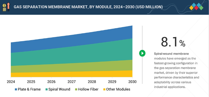 モジュール別には、プレート&フレーム、スパイラルワインド、中空糸、その他のモジュールがあります。プレート&フレームモジュールは、比較的シンプルな積み重ね可能な構造で、交換や洗浄が容易であり、一般的に小規模または特殊な用途で使用されます。スパイラル巻きモジュールは、高い充填密度とコストの妥協点であり、工業用分離や大規模な天然ガス分離に使用される最も一般的なモジュールです。中空糸モジュールは、何千本もの小さな繊維を束ねたもので、水素回収、窒素生成、バイオガス改良などの用途で比較的高い能力を発揮します。