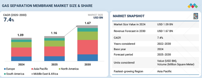 ガス分離膜市場は、2025年の11.6億米ドルから2030年には16.7億米ドルに達すると予測され、2025年から2030年までの年平均成長率は7.4%。ガス分離膜は、新技術が規制遵守を提供し、産業界が分離技術をよりクリーンな方法で提供し、エネルギー使用を少なくすることを要求し始めているため、将来的にかなりの成長が見込まれています。