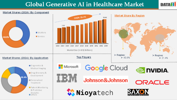 ヘルスケアにおけるジェネレーティブAI市場における主な世界的プレーヤーには、IBM、Google LLC、Microsoft、OpenAI、NVIDIA Corporation、Oracle、Johnson & Johnson Services, Inc.、NioyaTech、Saxonなどが含まれます。