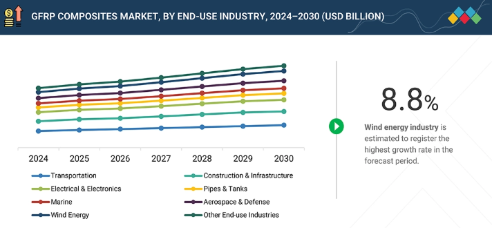 GFRP複合材料は、輸送、建設・インフラ、電気・電子、パイプ・タンク、海洋、航空宇宙・防衛、風力エネルギー、その他の最終用途産業で広く使用されています。