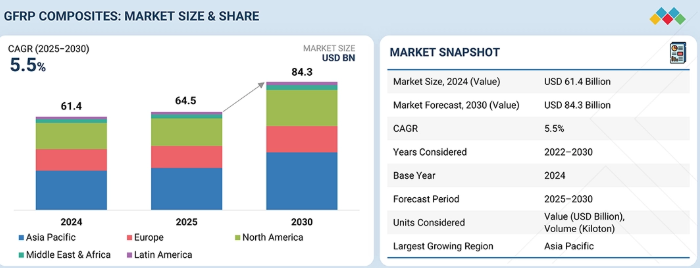 GFRP複合材料市場は、年平均成長率5.5%で、2025年の645億米ドルから2030年には843億米ドルに達すると予測されています。GFRP複合材料は、微細なガラス繊維で強化された熱硬化性または熱可塑性ポリマーで構成されています。ガラス繊維は、炉でガラスを溶かし、溶けたガラスを超微細な穴の中に移して細いガラスフィラメント/繊維を作ることで製造されます。GFRP複合材料は、高強度ガラス繊維を高分子樹脂の中に埋め込むことによって作られ、驚くべき強度と耐久性を誇る材料となります。GFRP複合材料のガラス繊維は、Eガラス、Sガラスなど様々な種類のガラスを使用することができ、それぞれ特定の用途に適した特性を備えています。ポリマー樹脂マトリックスには、熱硬化性樹脂や熱可塑性樹脂が使用され、強度、柔軟性、耐薬品性などの異なる特性を備えています。これらの材料を組み合わせることで、軽量で耐食性に優れた高強度材料が実現し、さまざまな業界の特定の要件に合わせてカスタマイズすることができます。