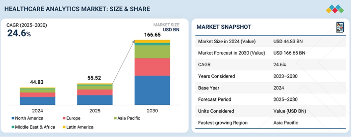 世界のヘルスケア分析市場は、2024年に448億3000万米ドルと評価され、2025年には555億2000万米ドルに達し、2025年から2030年にかけて24.6%という堅調なCAGRで成長し、期間終了時には1666億5000万米ドルに達すると予測されている。この成長は、医療データの増加、AIおよび高度な分析技術の拡大、価値に基づく医療への注目の高まり、集団健康管理、そして医療システム全体における臨床成果の向上、業務効率化、コスト管理の必要性によって支えられています。