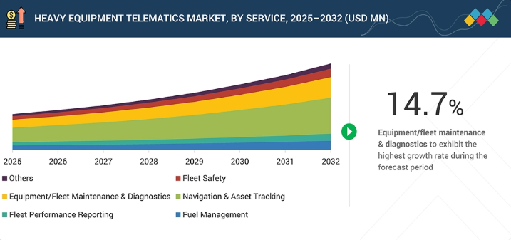 重機テレマティクス市場は、2025年の13億3000万米ドルから2032年までに32億1000万米ドルへ、年平均成長率(CAGR)13.4%で成長すると予測されている。燃料費の高騰、機器故障、機器盗難の増加により、機器メーカー/オペレーターは自社フリートへのテレマティクス導入を推進している。テレマティクスサービスは燃料効率の管理、アイドリング時間の削減、稼働時間の向上を支援し、最終的に総合効率の向上につながる。さらに、建設現場や鉱山現場における安全規制の強化により、フリートの安全性とオペレーター監視が不可欠となり、市場の成長を促進している。