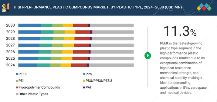 PEEKは、高性能プラスチックコンパウンド市場において最も急速に成長しているプラスチック種セグメントであり、予測期間中に11.3%のCAGRで成長すると見込まれています。