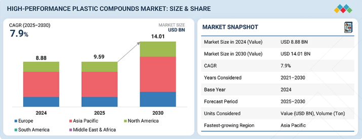 高性能プラスチックコンパウンド市場は、予測期間中に年平均成長率(CAGR)7.9%で拡大し、2025年の95億9,000万米ドルから2030年には140億1,000万米ドルに達すると見込まれています。高性能材料に対する需要の高まりは、業界全体で強度が高く軽量な材料へのニーズが高まっていることなど、いくつかの主要な要因に起因しています。都市開発やインフラプロジェクトが、住宅および商業ビル双方で使用される高性能プラスチックコンパウンドの需要増加を牽引しています。さらに、最も急速に成長しているセグメントである航空宇宙産業では、軽量かつ高強度で耐熱性のある材料が求められており、これらのコンパウンドに対する需要が非常に高まっています。炭素繊維は高性能プラスチックコンパウンドの主要な添加剤であり、一方、PEEKはその優れた熱的、機械的、化学的特性から最も普及している高性能プラスチックです。これらの材料は、自動車やエレクトロニクスなどの産業でますます活用されています。さらに、アジア太平洋地域を中心とした発展途上地域における急速な工業化が、生産能力の継続的な拡大を牽引しています。最後に、持続可能で低排出の材料への関心の高まりが、リサイクル可能な高性能プラスチックコンパウンドの需要を後押ししています。