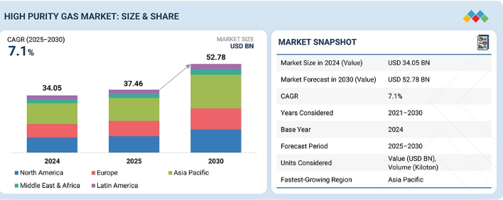 高純度ガス市場は、2025年の374億6,000万米ドルから2030年には527億8,000万米ドルに成長し、予測期間中のCAGRは7.1%を記録すると予測されています。都市化の進展と、エレクトロニクス、金属生産、石油・ガス、化学、食品・飲料、医療・ヘルスケア産業における用途の拡大が、高純度ガスの需要を増大させています。